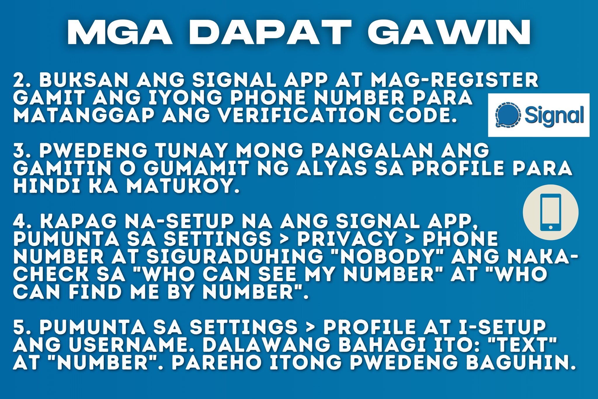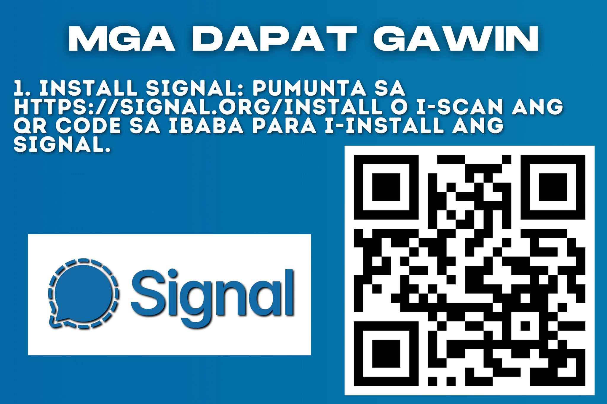 Para maprotektahan ang identity at privacy ng mga individual na kalahok, gamitin natin ang Signal Messenger. Tiyak na end-to-end encrypted ito at walang kumpanya o government body ang magkokontrol nito. Maaari kang gumawa ng alias sa iyong profile at username for sharing as contact info. Hindi mo kailangan i-share ang iyong tunay na pangalan at phone number. Sundan ang mga hakbang sa ibaba.