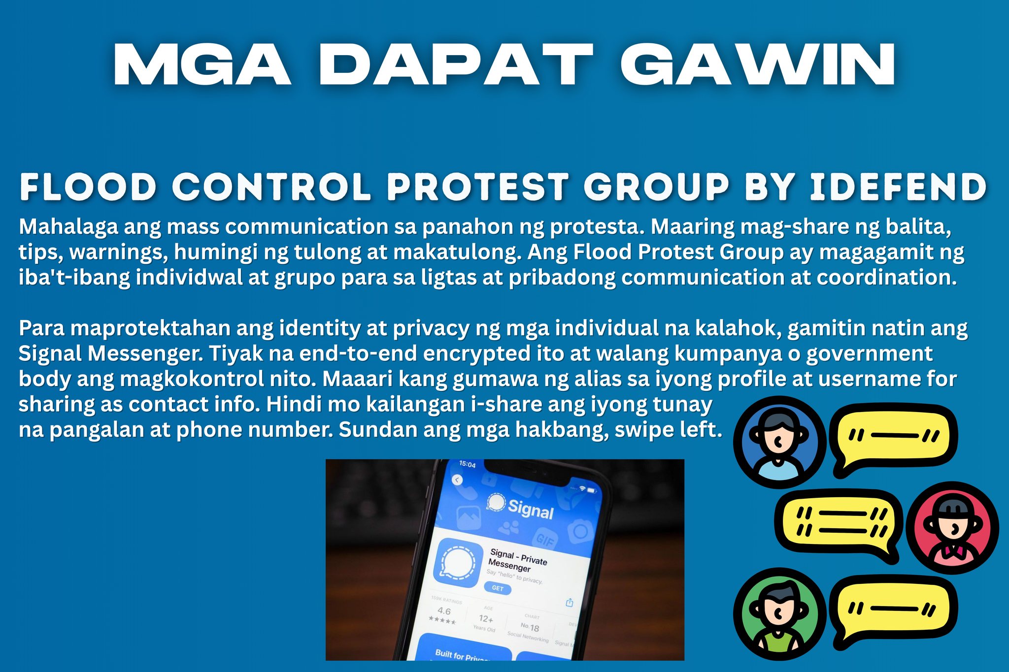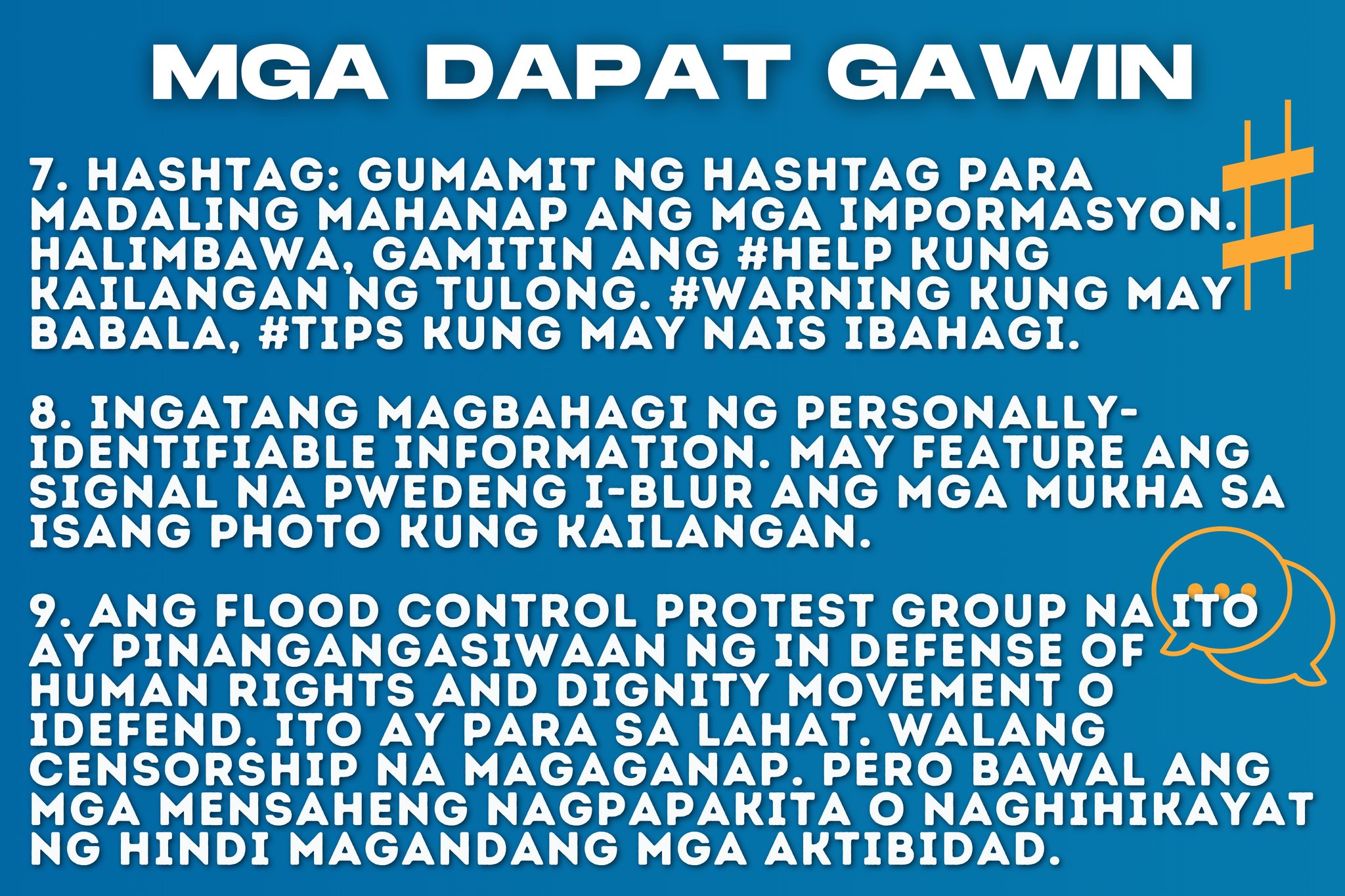 Ang Flood Control Protest group na ito ay pinangangasiwaan ng In Defense of Human Rights and Dignity Movement o iDEFEND. Ito ay para sa lahat. Walang censorship na magaganap. Pero bawal ang mga mensaheng nagpapakita o naghihikayat ng hindi magandang mga aktibidad.