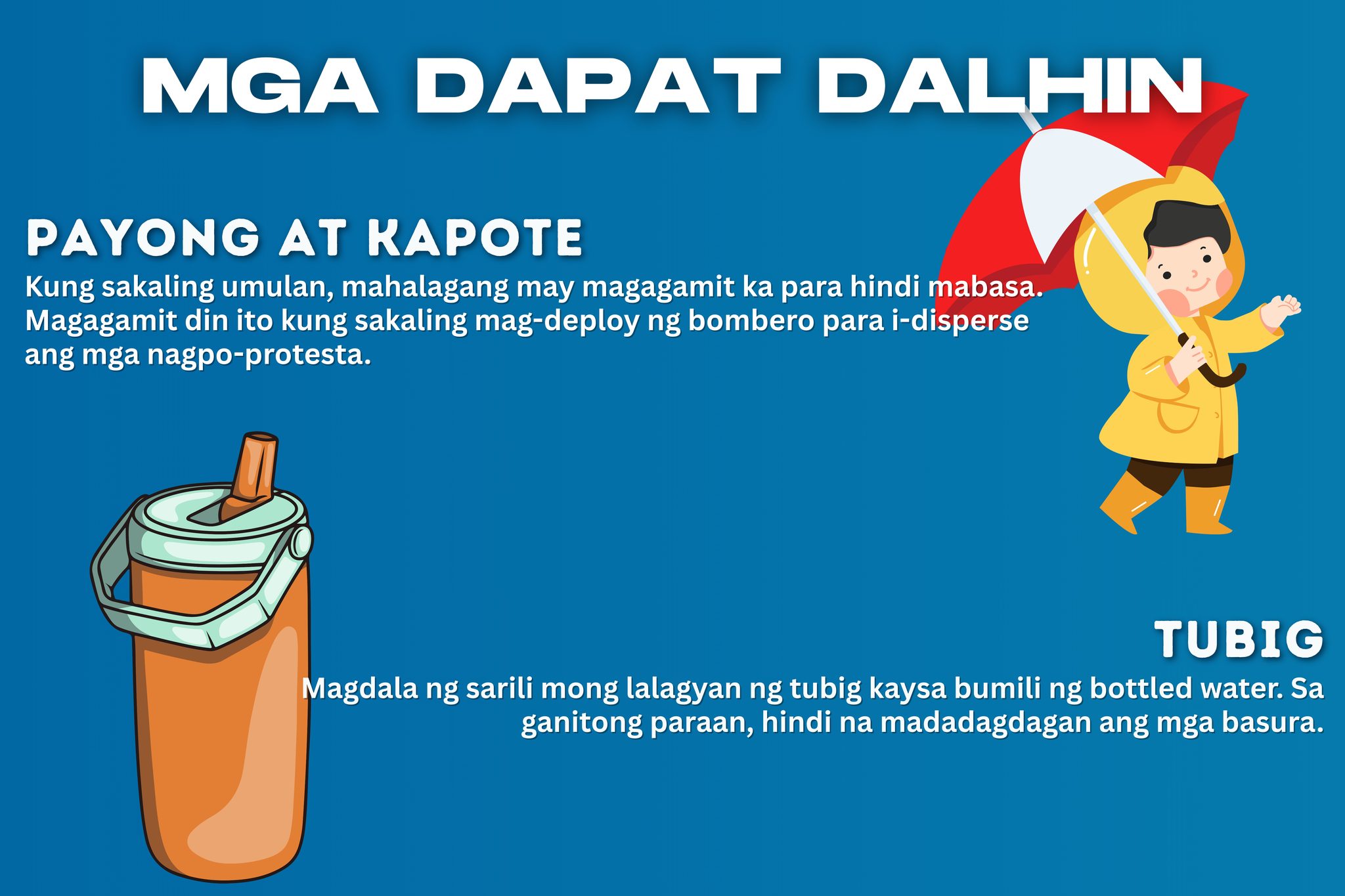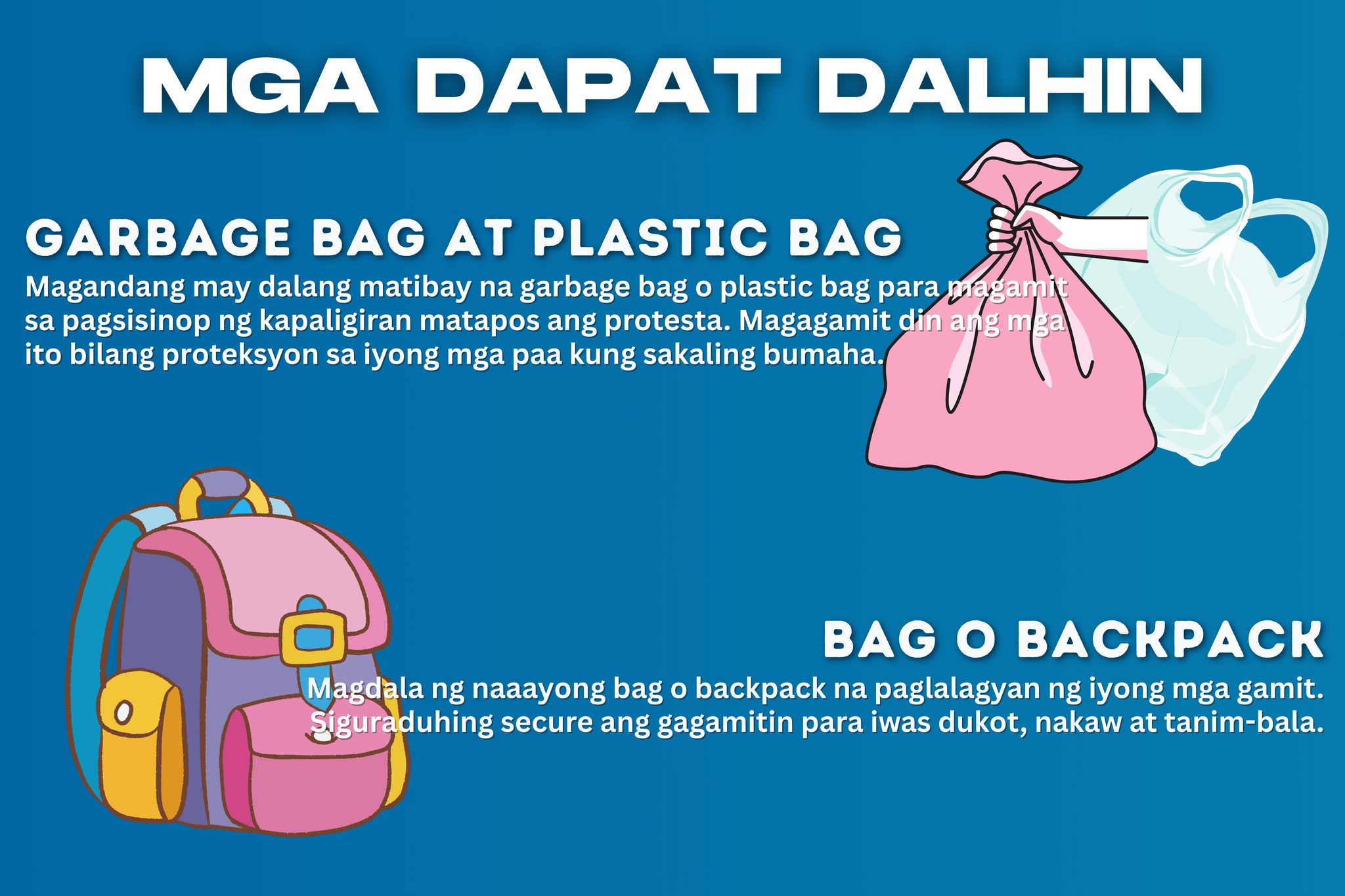 Magandang may dalang matibay na garbage bag o plastic bag para magamit sa pagsisinop ng kapaligiran matapos ang protesta. Magagamit din ang mga ito bilang proteksyon sa iyong mga paa kung sakaling bumaha.