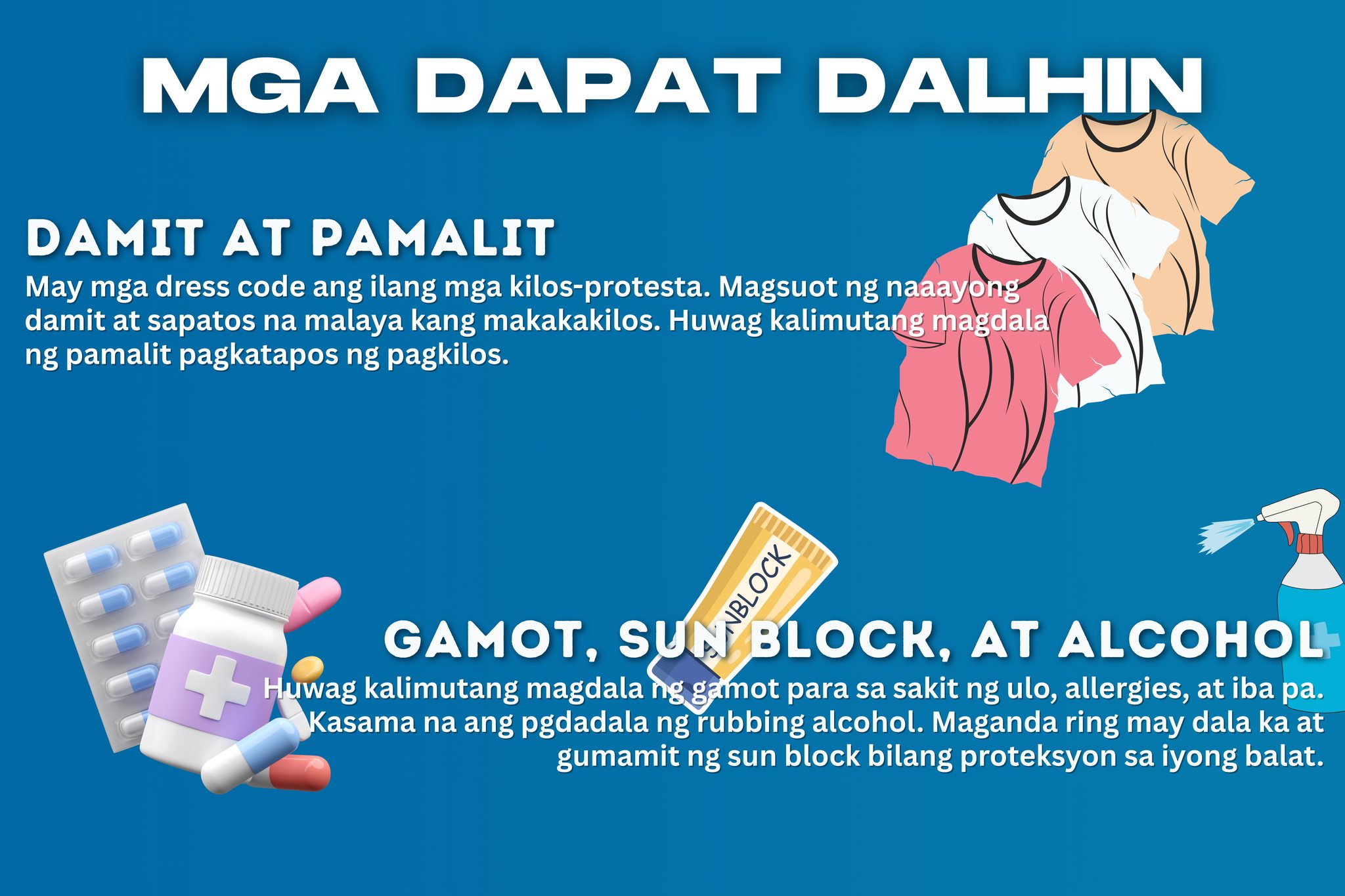 May mga dress code ang ilang mga kilos-protesta. Magsuot ng naaayong damit at sapatos na malaya kang makakakilos. Huwag kalimutang magdala ng pamalit pagkatapos ng pagkilos.