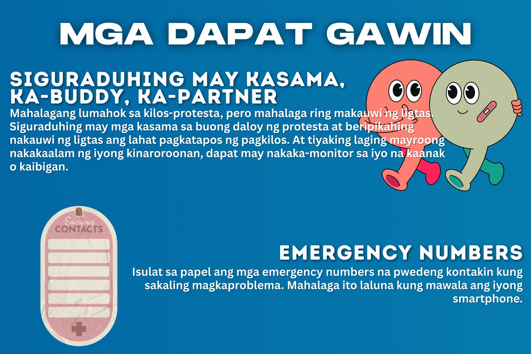 Mahalagang lumahok sa kilos-protesta, pero mahalaga ring makauwi ng ligtas. Siguraduhing may mga kasama sa buong daloy ng protesta at beripikahing nakauwi ng ligtas ang lahat pagkatapos ng pagkilos. At tiyaking laging mayroong nakakaalam ng iyong kinaroroonan, dapat may nakaka-monitor sa iyo na kaanak o kaibigan.