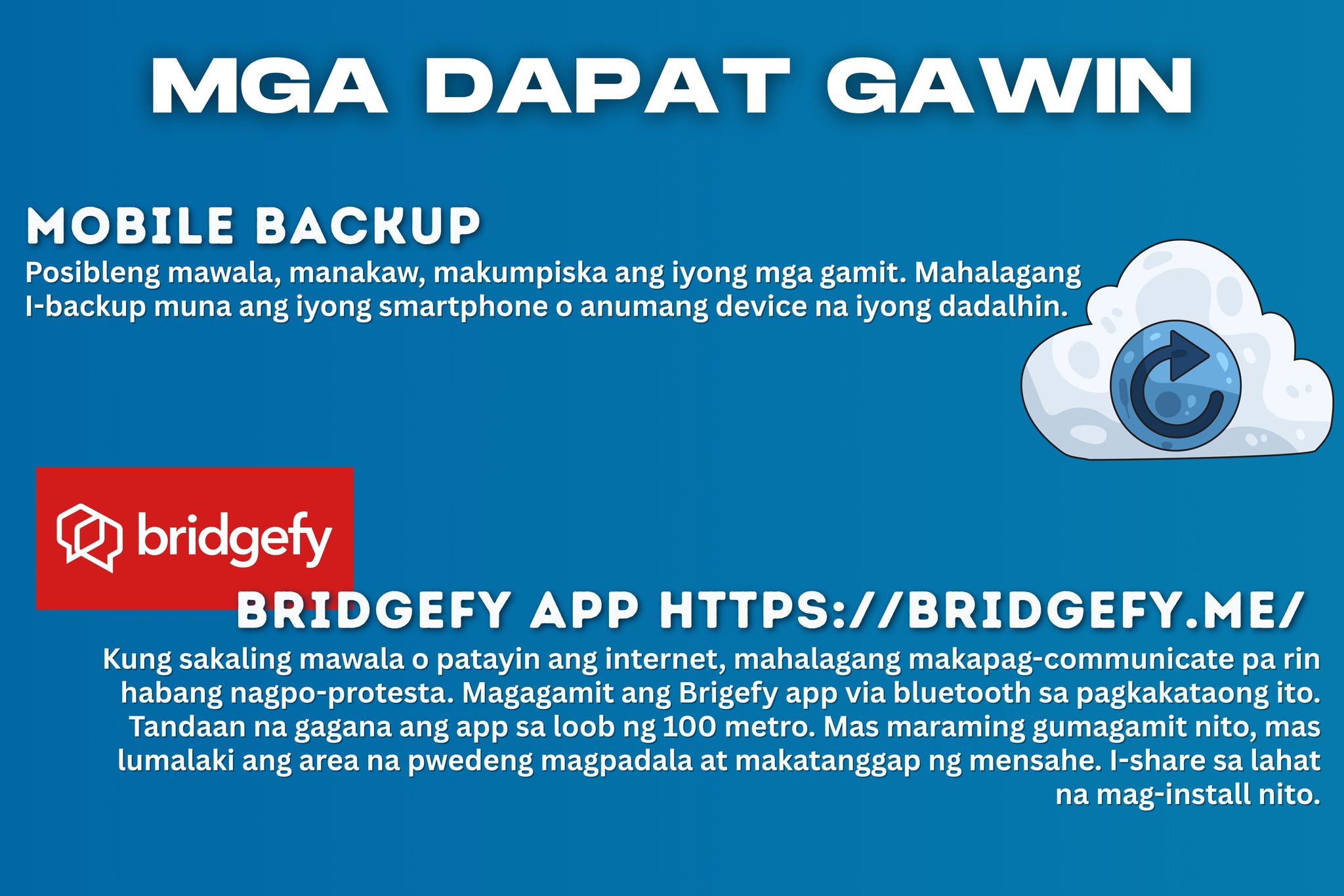 Kung sakaling mawala o patayin ang internet, mahalagang makapag-communicate pa rin habang nagpo-protesta. Magagamit ang Brigefy app via bluetooth sa pagkakataong ito. Tandaan na gagana ang app sa loob ng 100 metro. Mas maraming gumagamit nito, mas lumalaki ang area na pwedeng magpadala at makatanggap ng mensahe. I-share sa lahat na mag-install nito.
